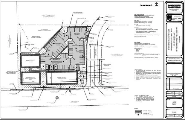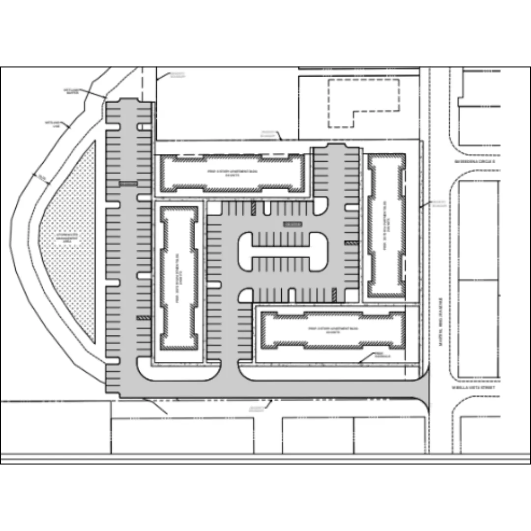 Improved site plan showing placement of office and three-story apartments.