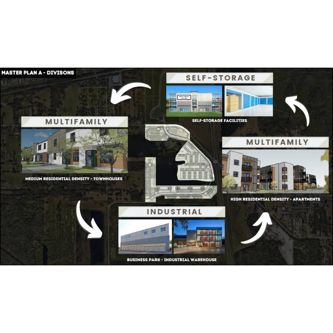Mixed-use vision with residential, industrial, and storage uses integrated into a master-planned site.
